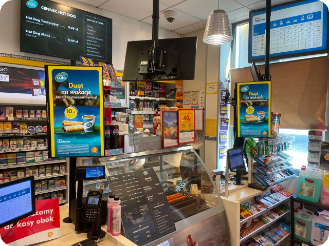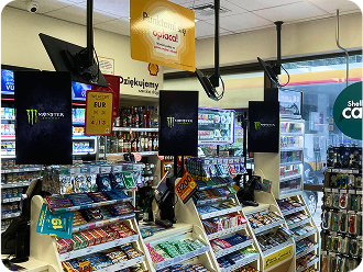 Displaying advertisements on digital screens in the waiting area by the cash registers at fuel stations throughout Poland